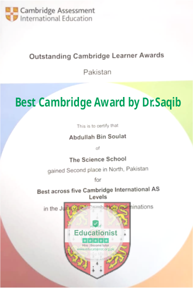 - “I am immensely grateful to Dr. Saqib for his unwavering support and guidance, which enabled me to excel in A-level Mathematics and secure an A+ grade. His commitment to his students’ success is truly commendable, and I highly recommend him to anyone aspiring to achieve academic excellence.” – Abdullah Bin Shaukat